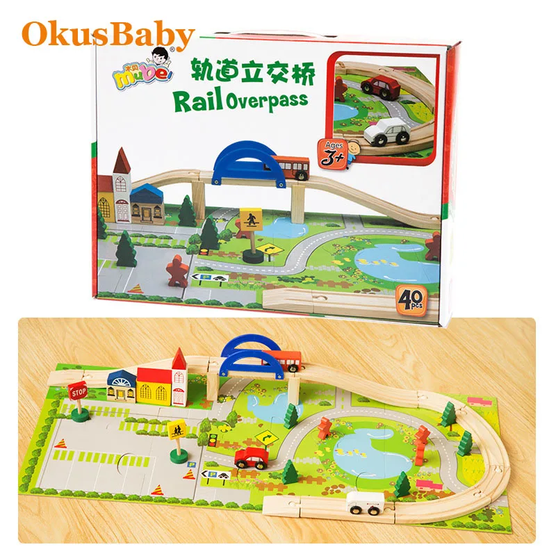 40pcs Set Wooden Educational City Transport Track Building Blocks Flyover Combination Toy Kit Rail