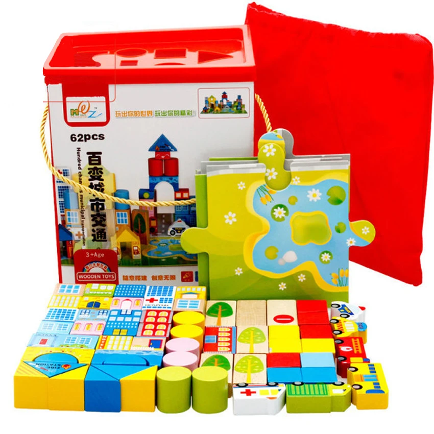 HIGH QUALITY DOLLRYGA 62pcs Wooden City Building Blocks Early Educational Kid Toy Geometric Assembling Building